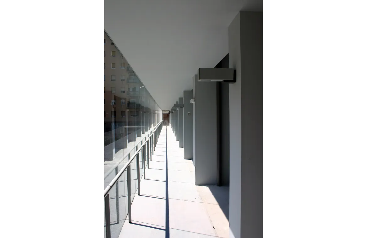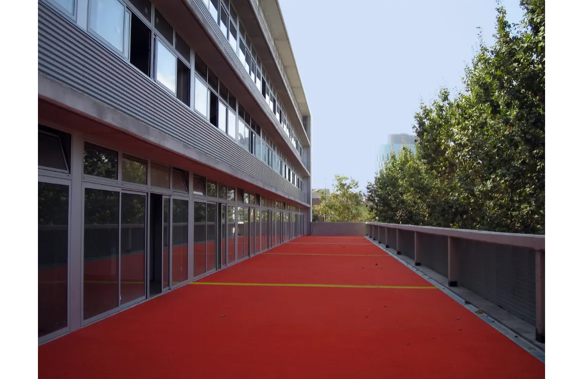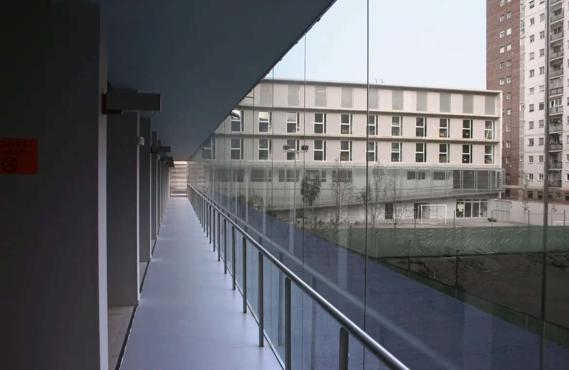 Centre escolar de 2 línies d’escola bressol, infantil, primària i secundària, i pavelló poliesportiu. Es col·loca l’edificació alineada als carrers principals, d’acord a la trama de l’eixample, separant-se de l’edificació de gran alçada existent i deixant el pati a l’interior. El nucli principal d’aules s’orienta a la futura plaça, zona més tranquil·la i amb orientació adequada (nord-est). El pavelló s’integra amb l’escola però amb possible funcionament independent.