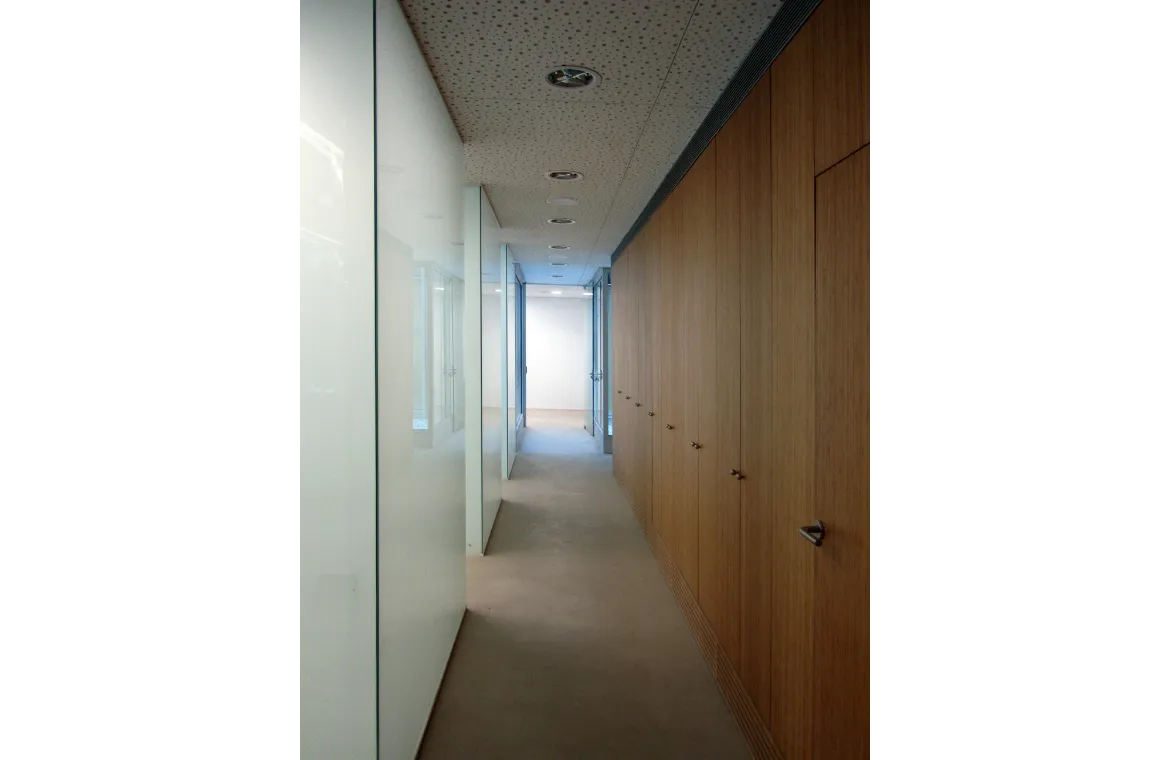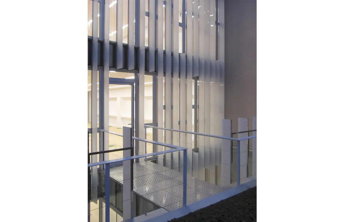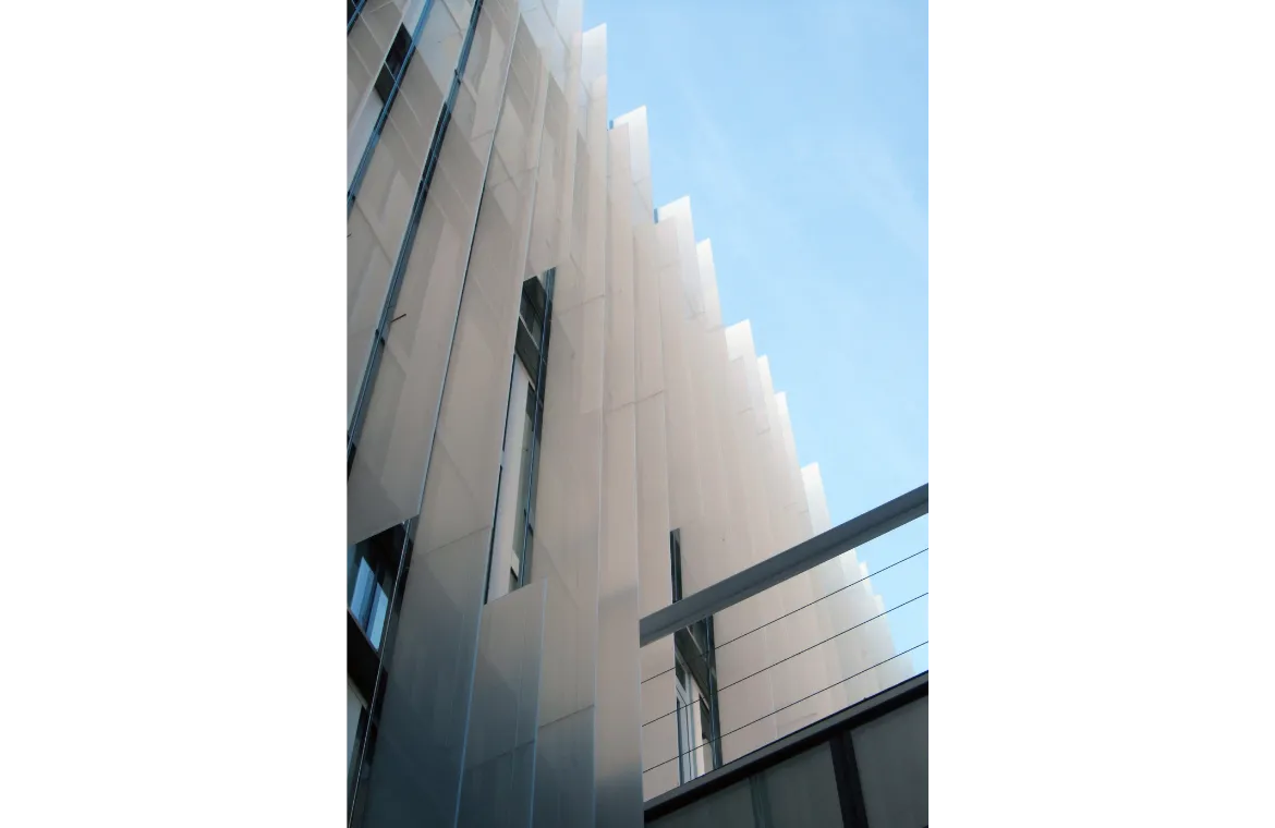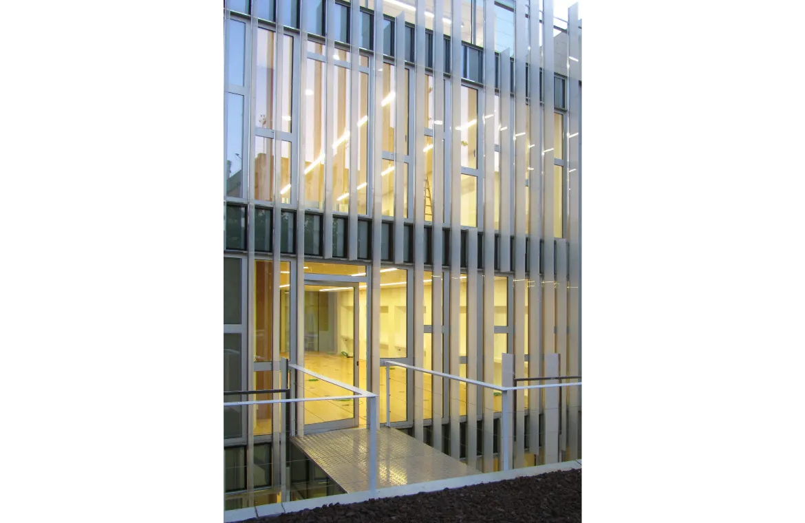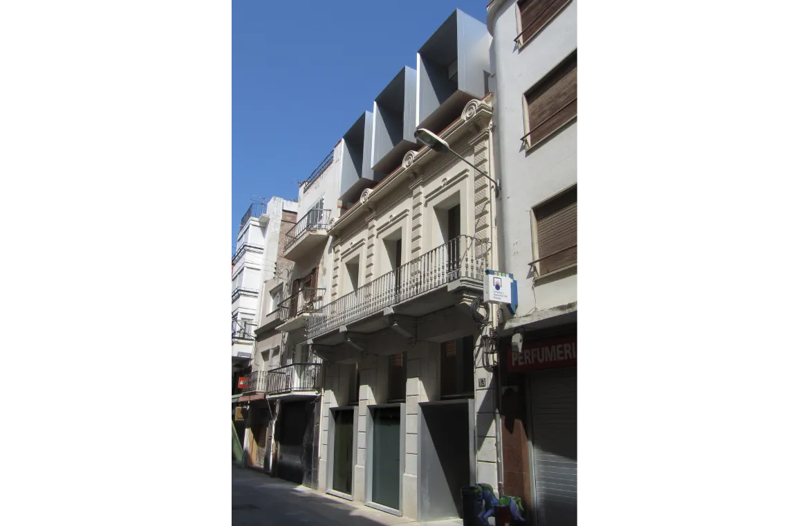 La decisió de conservar la façana permet integrar l’edifici dins del casc antic, mantenint la imatge del carrer i alhora, conferir-li singularitat i caràcter. L’edifici es composa de 2 cossos, el principal de 5 plantes reculat de la façana original, amb una façana lleugera i transparent contrastant amb la de pedra i estuc existent i permetent conciliar el nou edifici a les alçades i obertures de la façana antiga, actuant aquesta com la pell exterior de protecció solar i dissipació tèrmica d’una façana ventilada. La façanes interiors són vidriades amb lamel·les verticals de vidre traslluït per protecció i difusió de la radiació solar. La coberta es corba per aconseguir un espai sota-coberta de qualitat A la part posterior hi ha el cos baix, separat per un pati del principal per il·luminar i ventilar les plantes inferiors. El programa s’organitza de manera similar en totes les plantes. A partir d’un cos d’armaris longitudinal es diferencia l’espai de treball del nucli de comunicació i serveis.