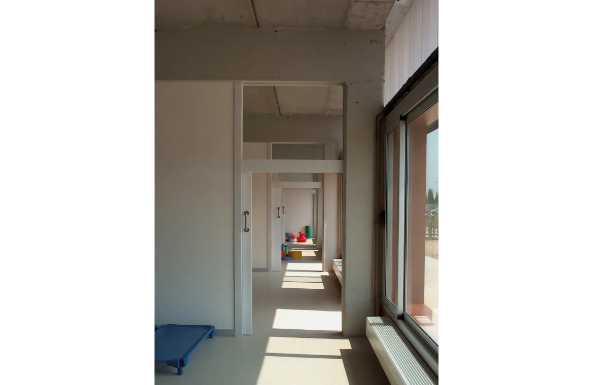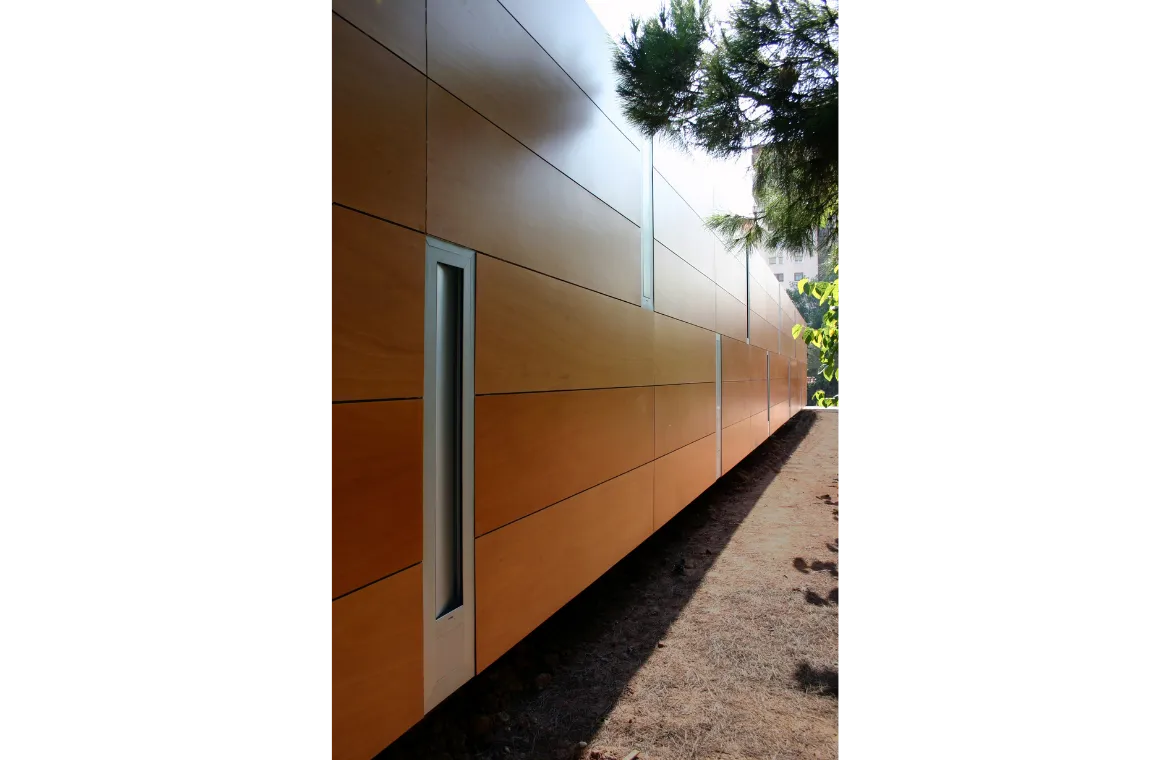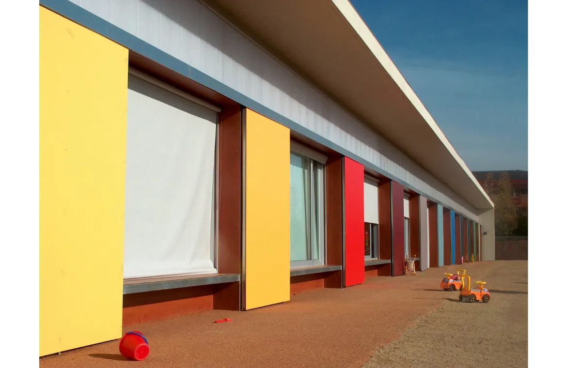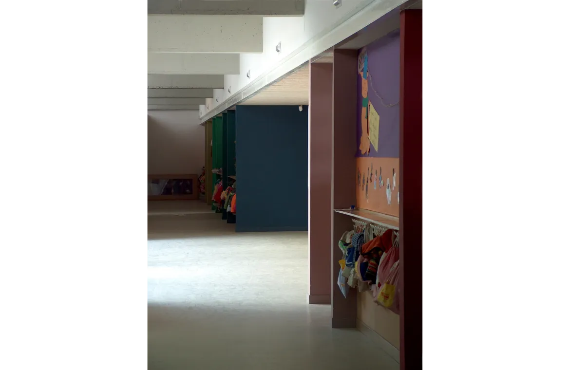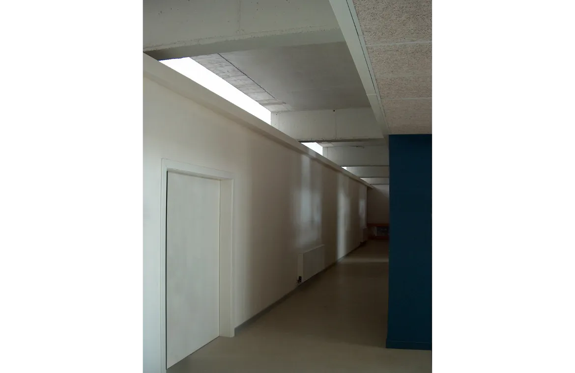 La voluntat ha sigut tractar l’edifici com un pavelló envoltat d’arbrat. Es configura en un bloc lineal, amb les aules i patis orientats a sud. El volum de les aules és més alt, darrera sobresurten els volums de serveis, més baixos, entre ambdòs es produeixen entrades de llum al passadís. A la coberta es repeteixen unes caixes de vidre blanc, patis-lluernaris que donen il.luminació als serveis interiors de les aules i permeten la ventilació creuada d’aquestes.