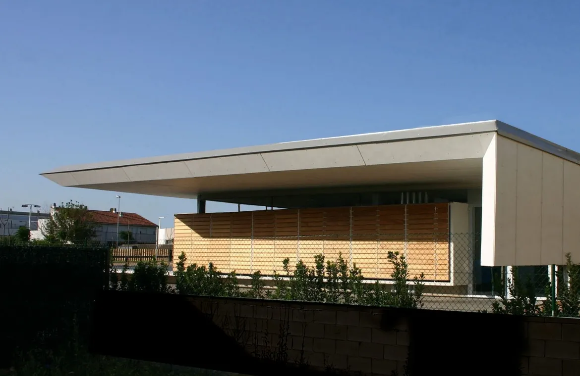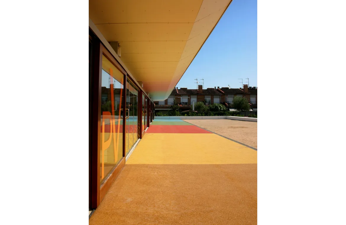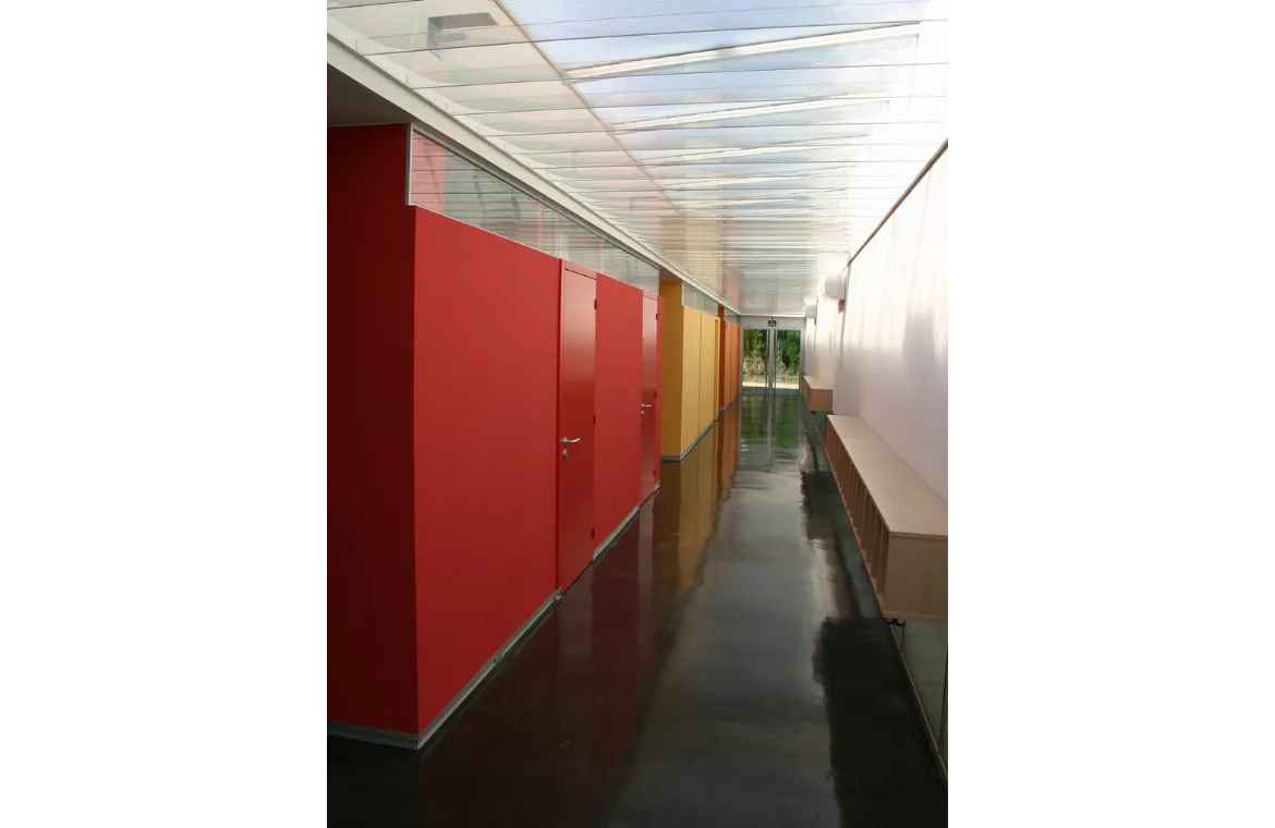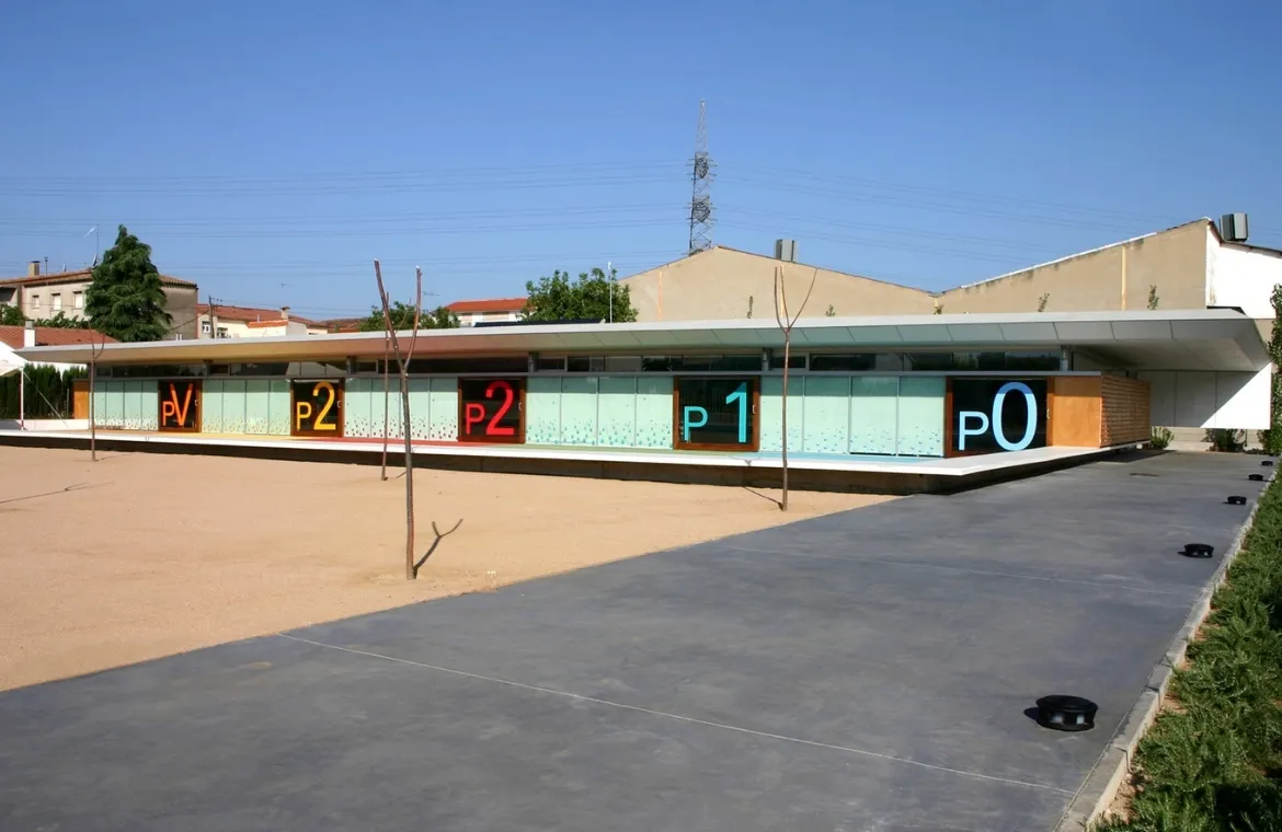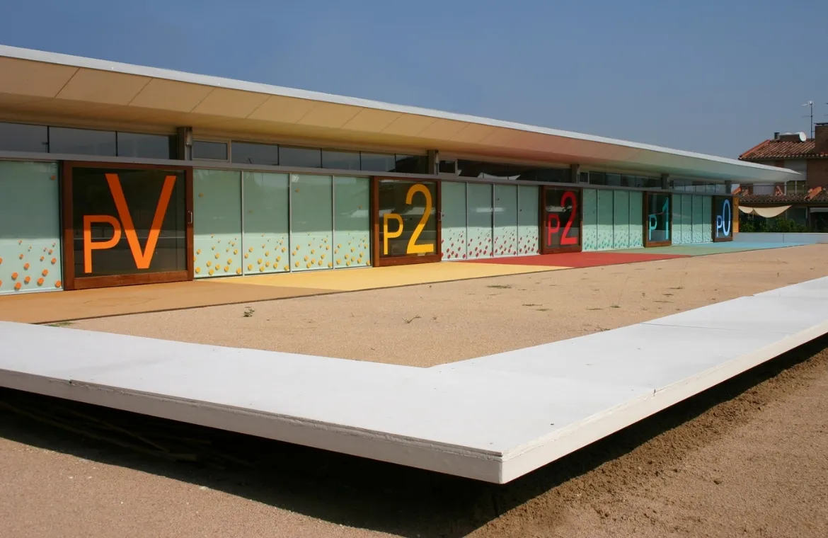 El pavelló de l’escola se situa al final del bosc, amb orientació sud-est. De forma linial, amb l’accés principal en un dels costats i l’accés de servei a l’altre, s’organitza en tres franges: el passadís, els serveis i les aules. Davant l’edifici, un bosc amb arbrat de fulla caduca, disposat geomètricament, que ens aporta sensació d’ordre, ens amaga zones de jocs, i ens fa de filtre amb l’aparcament.