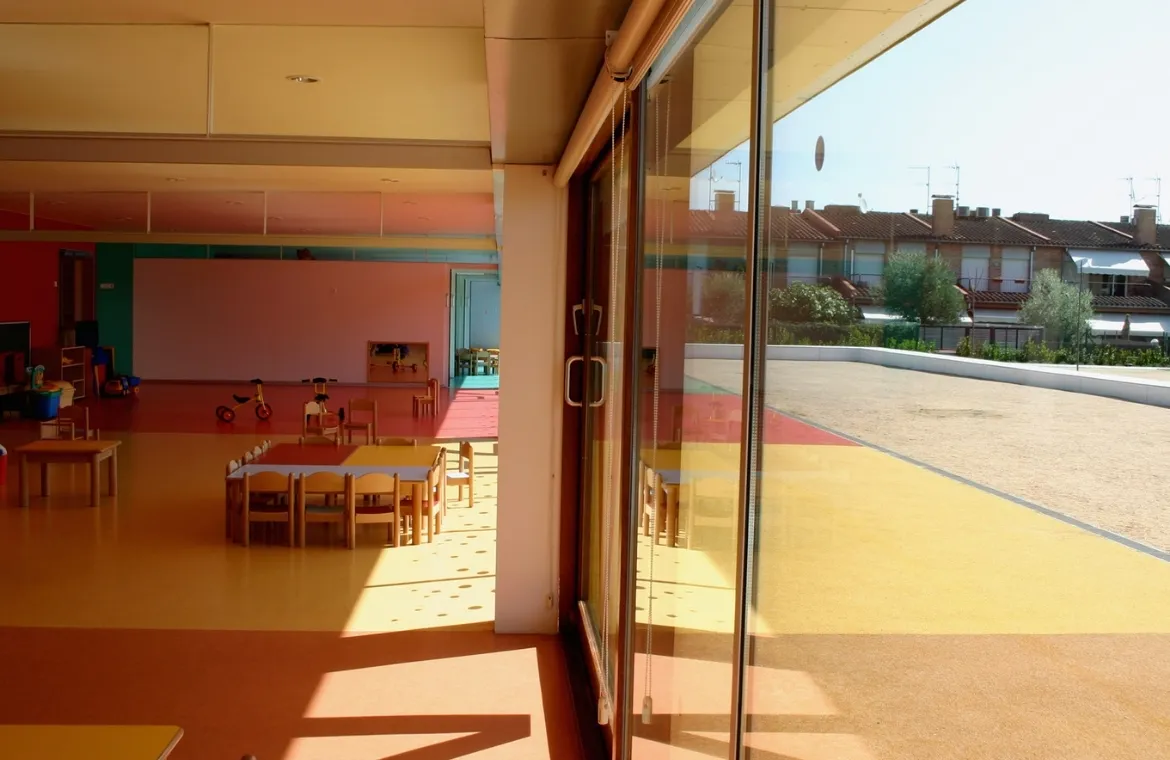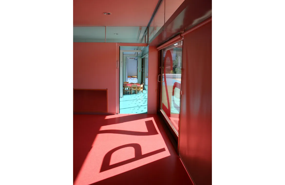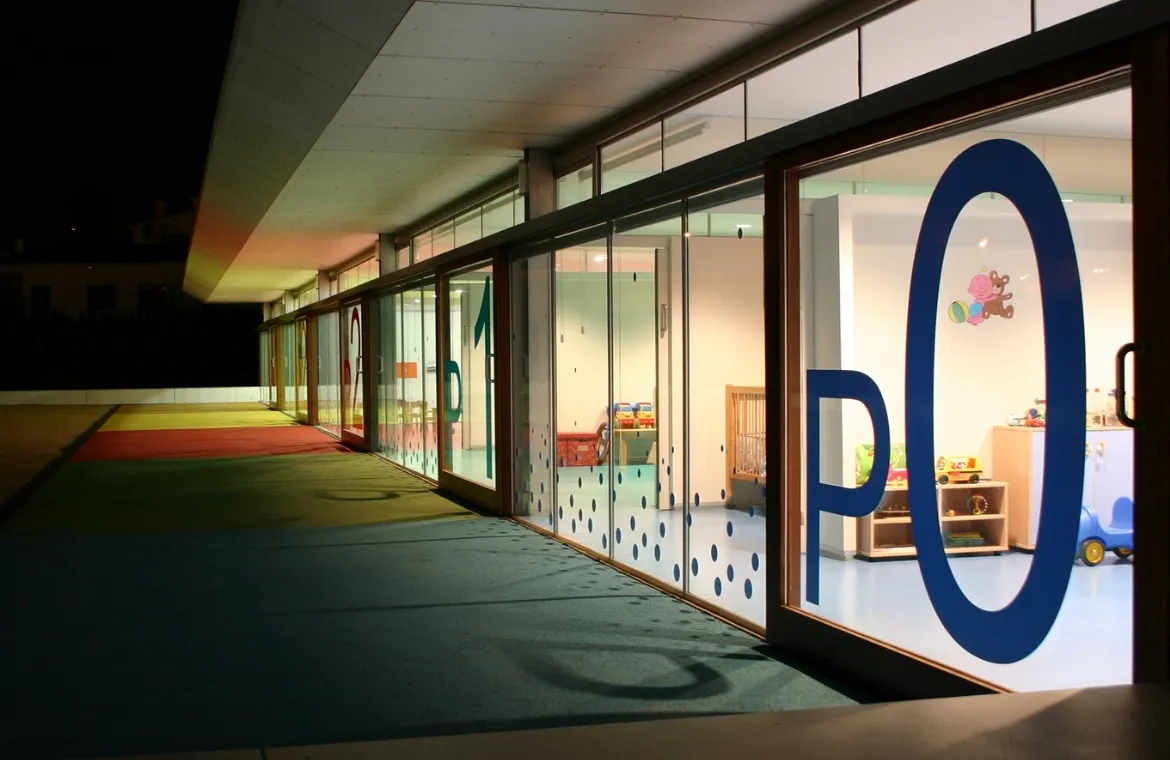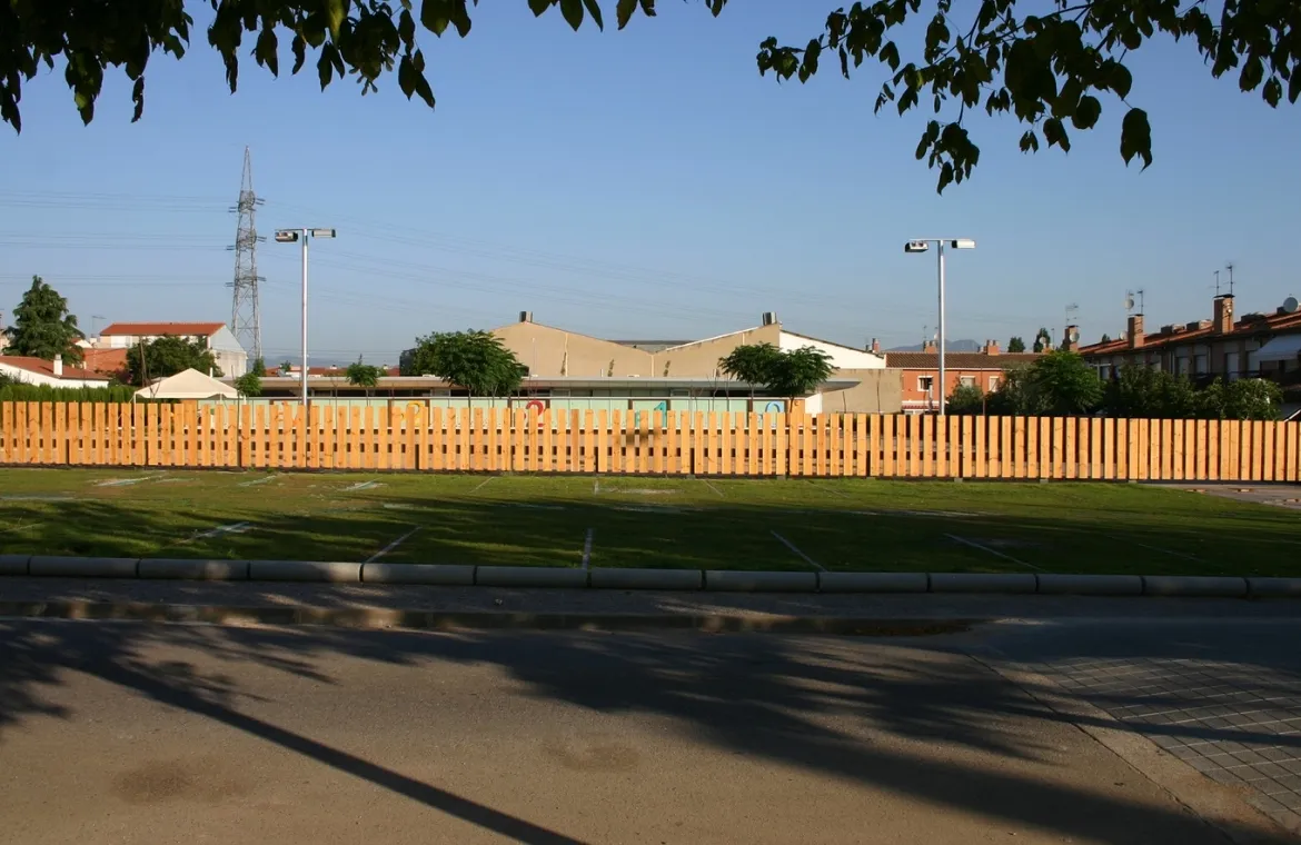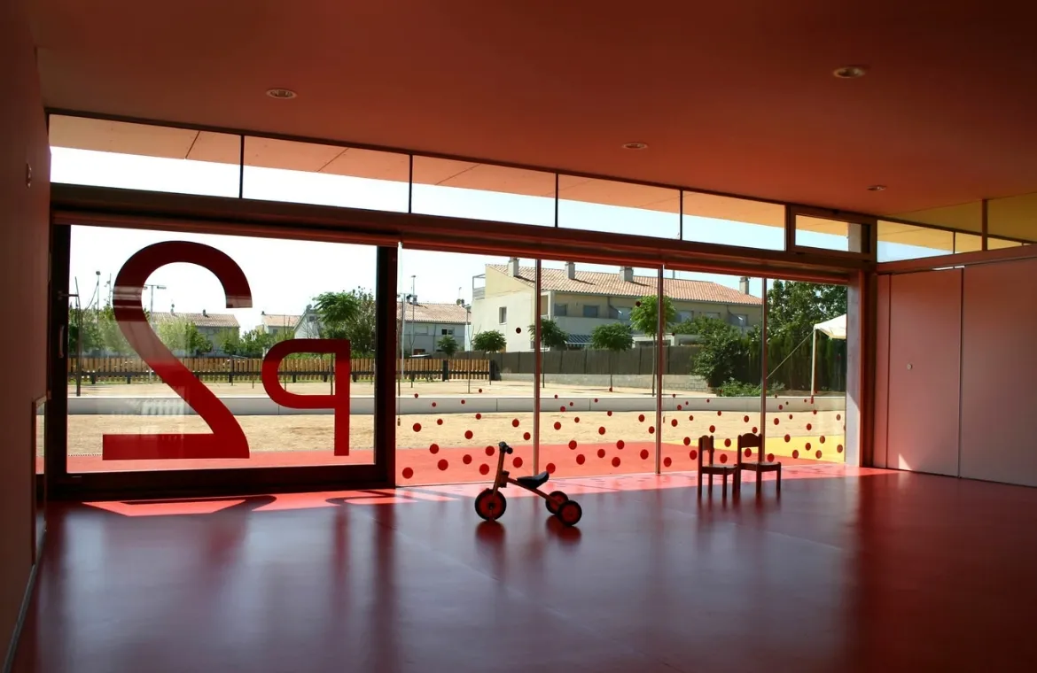 El pavelló de l’escola se situa al final del bosc, amb orientació sud-est. De forma linial, amb l’accés principal en un dels costats i l’accés de servei a l’altre, s’organitza en tres franges: el passadís, els serveis i les aules. Davant l’edifici, un bosc amb arbrat de fulla caduca, disposat geomètricament, que ens aporta sensació d’ordre, ens amaga zones de jocs, i ens fa de filtre amb l’aparcament.