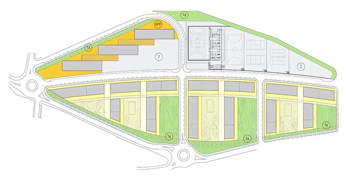 Desenvolupament de l’ordenació residencial establerta, prevent una franja d’equipaments on ubicar un poliesportiu. El teixit residencial s’estructura buscant la millor orientació alternant espais lliures privats i públics.